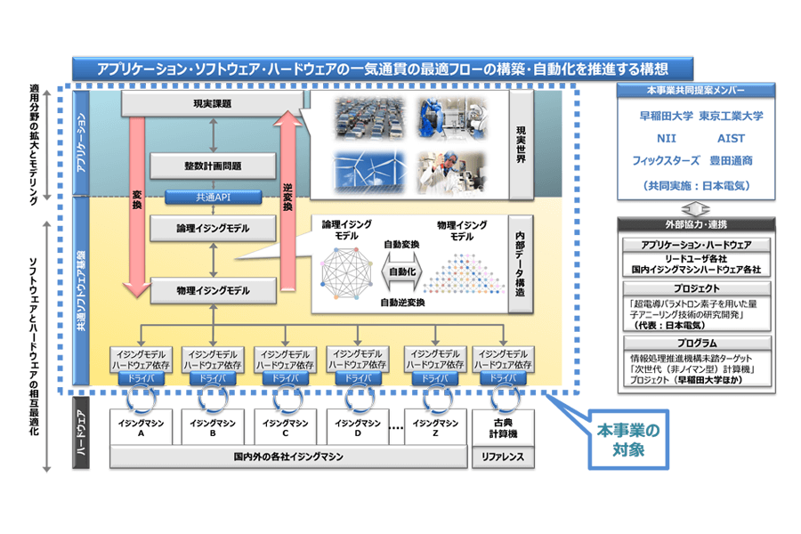 2018年9月5日、早稲田大学を代表事業者(研究開発責任者 理⼯学術院 ⼾川 望教授)とし、東京工業大学、情報・システム研究機構 国⽴情報学研究所(以下、NII)、国⽴研究開発法⼈ 産業総合技術研究所(以下、産総研)、豊田通商株式会社、株式会社フィックスターズの6機関を開発共同提案者としたグループは、国⽴研究開発法人新エネルギー・産業技術総合開発機構(以下、NEDO)が実施するプロジェクト「⾼効率・⾼速処理を可能とするAIチップ・次世代コンピューティングの技術開発」の研究開発項目の1つである「次世代コンピューティング技術の開発」に採択されました。採択件名は「イジングマシン共通ソフトウェア基盤の研究開発」(以下、本研究開発)です。事業期間は2018年度~2022年度です。また、日本電気株式会社は早稲田大学の共同実施先としてプロジェクトに参画します。