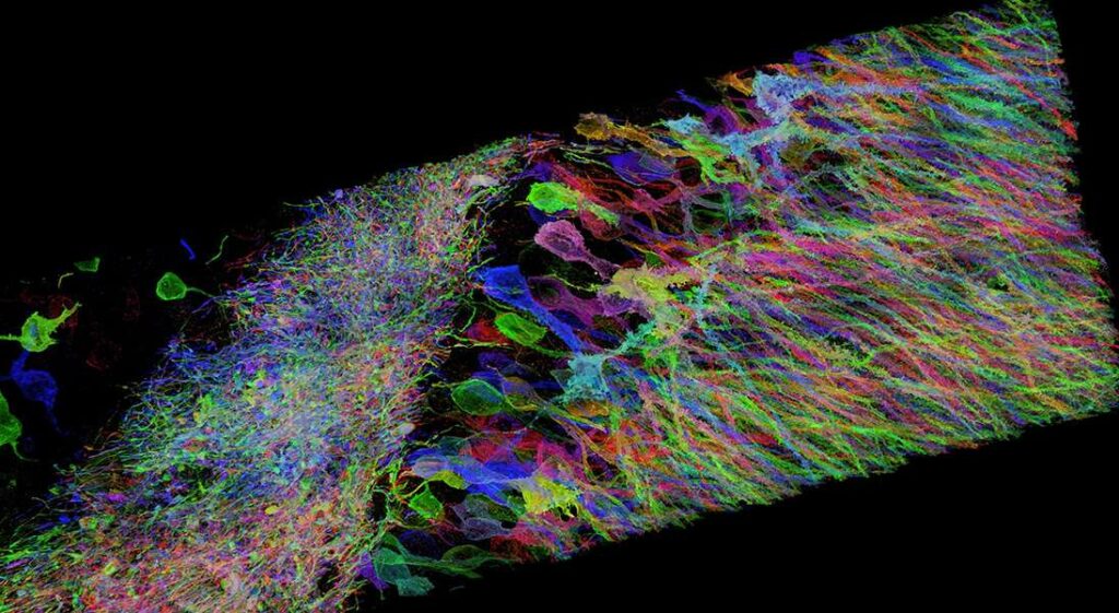 従来の光学顕微鏡では可視光の中で最も短い波長の半分程度の約200nm以下の物体はぼやけてしまい、脳細胞など複雑な組織の詳細な観察は出来ませんでした。エクスパンション顕微鏡法(Expansion microscopy)は観察したい生体試料を物理的に拡大することにより、光学顕微鏡の分解能を向上させる方法です。ポリマーを用いて生体試料を拡大することで、3次元、かつ、ナノスケールの解像度で複雑な組織を観測することができます [1] 。エクスパンション顕微鏡法では生体試料を拡大するので、顕微鏡の小さな視野で標本全体をカバーするために何度も画像を撮影します。生体試料の完全な3次元画像を得るためには、多数の高解像度画像ファイルを統合してつなぎ合わせる必要があります。これを実現するための適切なアプリケーション/ツールの選択は容易ではありませんでしたし、画像処理時間は数十時間以上かかることもあります。